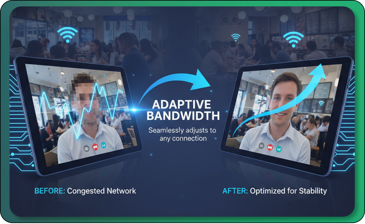 Adaptive Bandwidth Optimization: Our system intelligently and automatically adjusts video and audio quality in real-time based on each participant's individual internet connection strength. This dynamic optimization ensures a smooth, stable, and consistent meeting experience for everyone, minimizing lag and dropped connections across varying network conditions without any manual intervention.