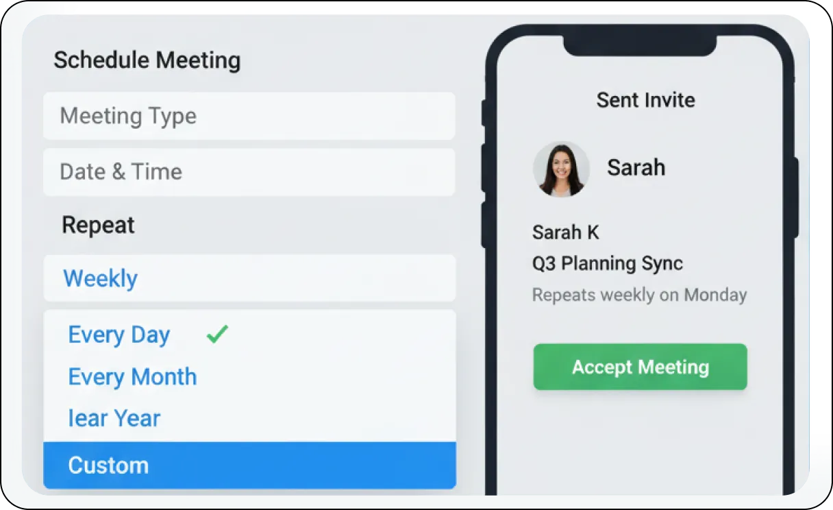 Recurring Meetings: Effortlessly schedule recurring meetings for regular team sync-ups, weekly client check-ins, ongoing project discussions, or daily stand-ups. You can set up the entire series once with preferred settings, and the system intelligently manages all subsequent instances, sending out reminders and links automatically.
